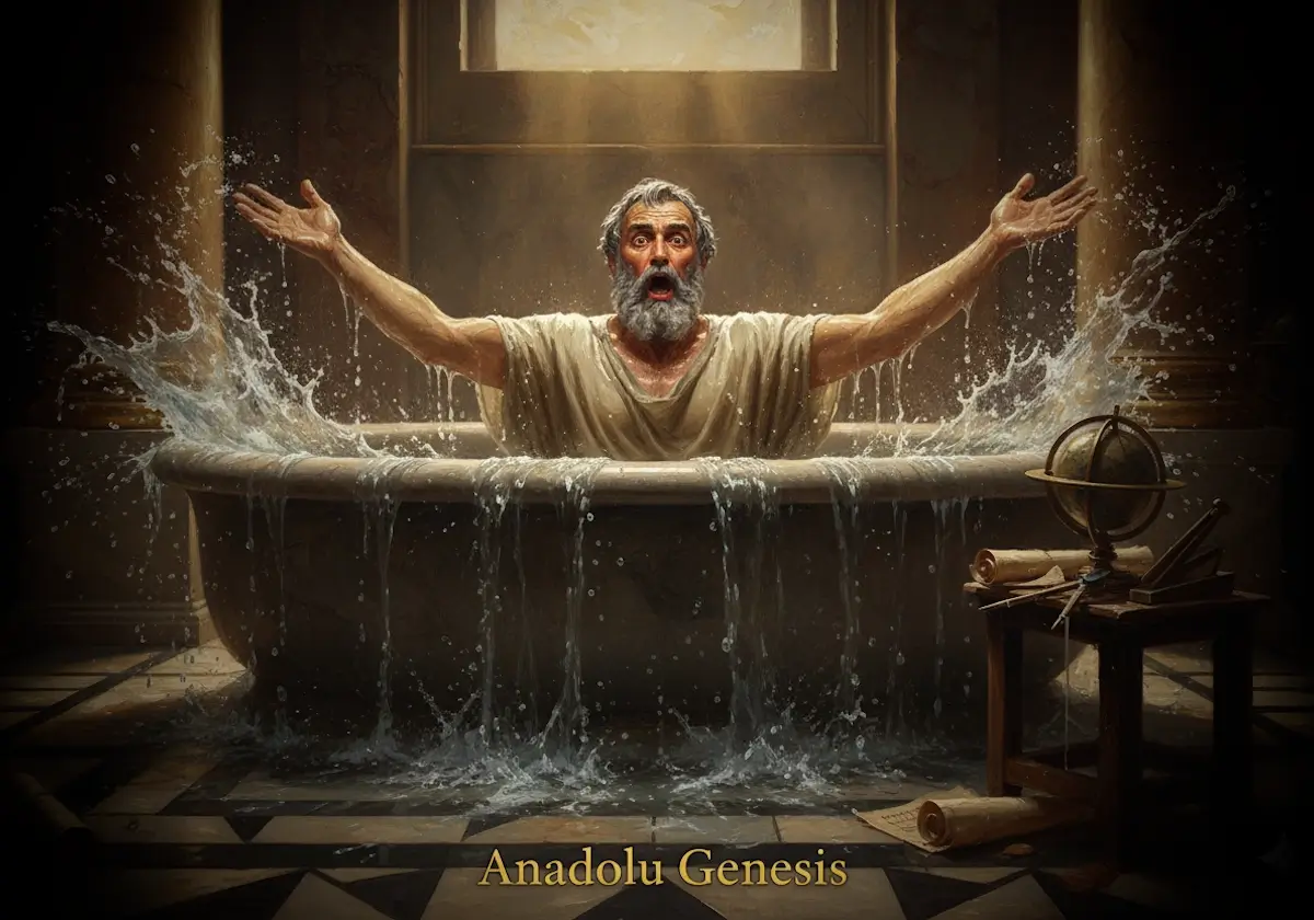 Heyecanla “Eureka!” (Buldum!) diye bağırarak sokaklara koştuğu anlatılır.