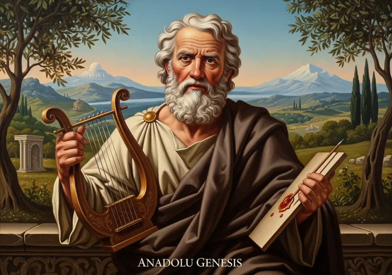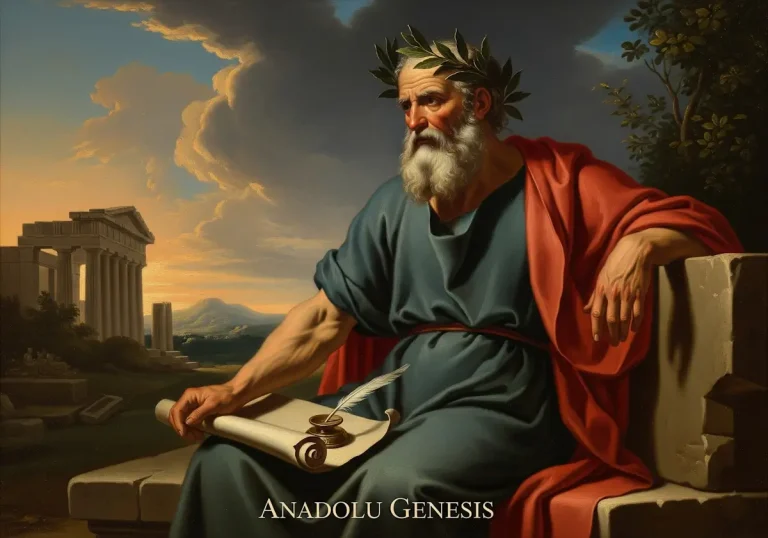 Hesiodos, Antik Yunan’ın epik şairidir. Theogonia ve İşler ve Günler ile mitoloji, ahlak ve insan yaşamını şekillendiren evrensel temaları işler.
