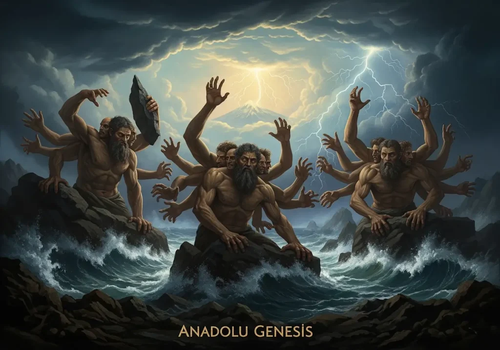 Hekatonkheirler, Antik Yunan mitolojisinin yüz elli devleri olarak, evrenin kaotik başlangıcında ve kozmik düzenin kuruluşunda kilit bir rol oynar. Gaia ve Ouranos’un çocukları olarak, Titanomakhia’da Zeus’un zaferini garantileyen korkutucu varlıklar, kaos ve gücün sembolüdür. Tartaros’un gardiyanları olarak rolleri, evrenin kaos ve düzen arasındaki dengesini vurgular. Anadolu Genesis olarak, Hekatonkheirler’in hikayesini araştırırken, onların kaos, güç ve kozmik adalet temalarını öne çıkarıyoruz. Hekatonkheirler’in mirası, psikoloji, edebiyat, sanat ve popüler kültürde yaşamaya devam eder; yüz kol ve elli baş, insanlığın doğayla, kaosla ve kendi içsel gücüyle olan ilişkisini aydınlatır.