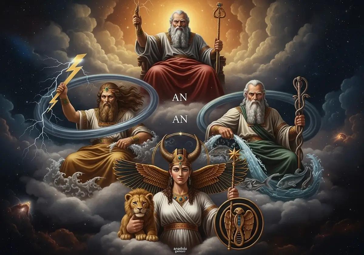 Sümer panteonu, göksel bir hiyerarşiyle organize edilmiş, doğa güçlerini kişileştiren tanrılardan oluşuyordu. An, gökyüzü tanrısı olarak, panteonun en üstünde yer alır ve evrensel otoriteyi temsil ederdi. Arkeolojik tabletler, An’ın Uruk’taki Anu Zigguratı’nda onurlandırıldığını gösterir; bu, gökyüzünün kozmik düzenin sembolü olduğunu yansıtır. Enlil, hava ve fırtına tanrısı olarak, Nippur’daki Ekur tapınağında kraliyet meşruiyetini bahşeden tanrıydı. Onun fırtınaları, Bereketli Hilal’in tarımsal döngülerini etkileyen yağmurları simgeler.